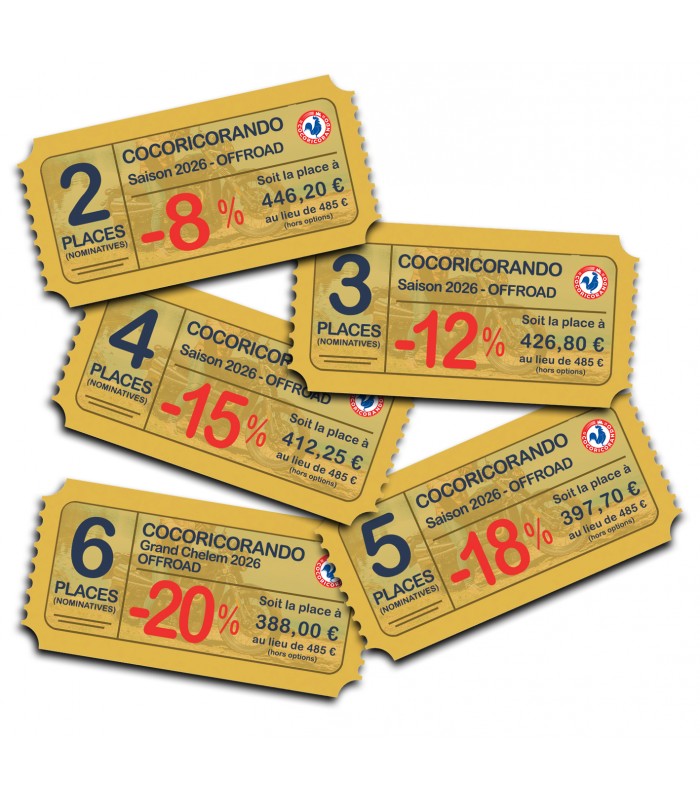 Offre avec tarif dégressif vous donnant des codes d'une valeur de 485 € chacun à valoir sur les événements Cocoricorando 2026.